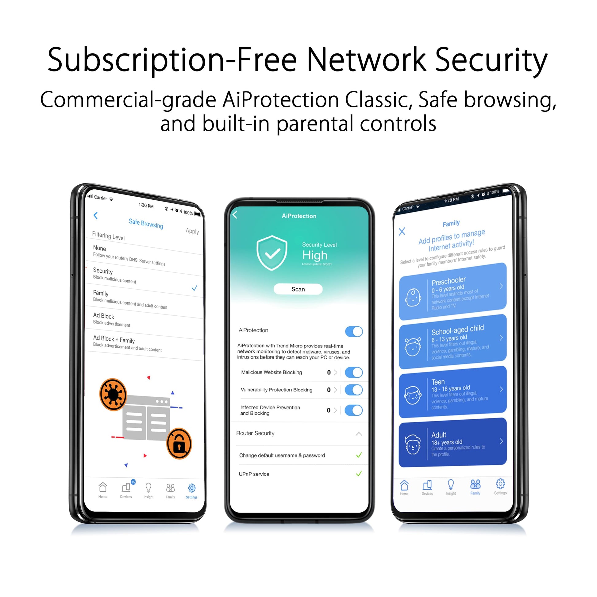 - Abonnementfreie Netzwerksicherheit auf kommerziellem Niveau mit AiProtection Classic powered by Trend Micro, plus einem Sicherheitsscan und Safe Browsing mit nur einem Klick