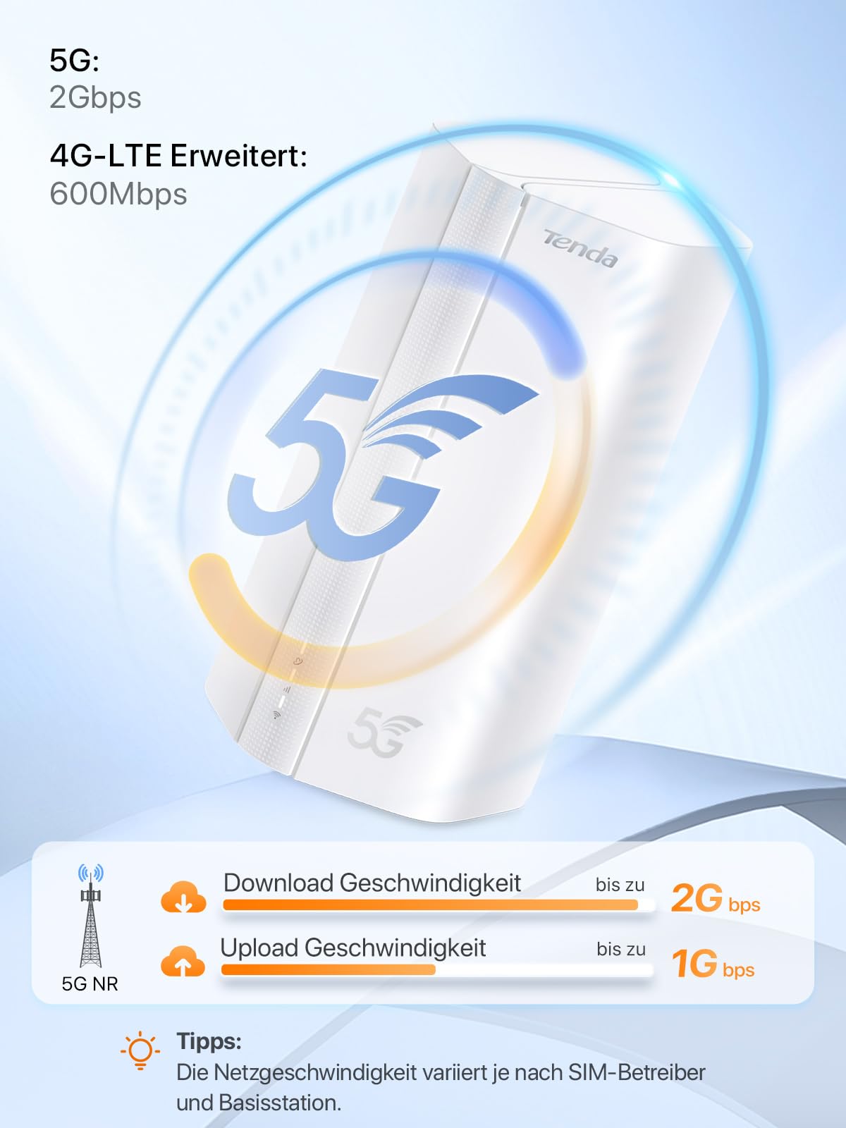 - 【5G-Router der Einstiegsklasse】5G-Geschwindigkeit beträgt bis zu 2,2 Gbps (Download: 2 Gbps, Upload: 1 Gbps), insbesondere für Gebiete ohne Glasfaser- oder Breitbandanschluss, und sorgt für zuverlässiges mobiles Wi-Fi