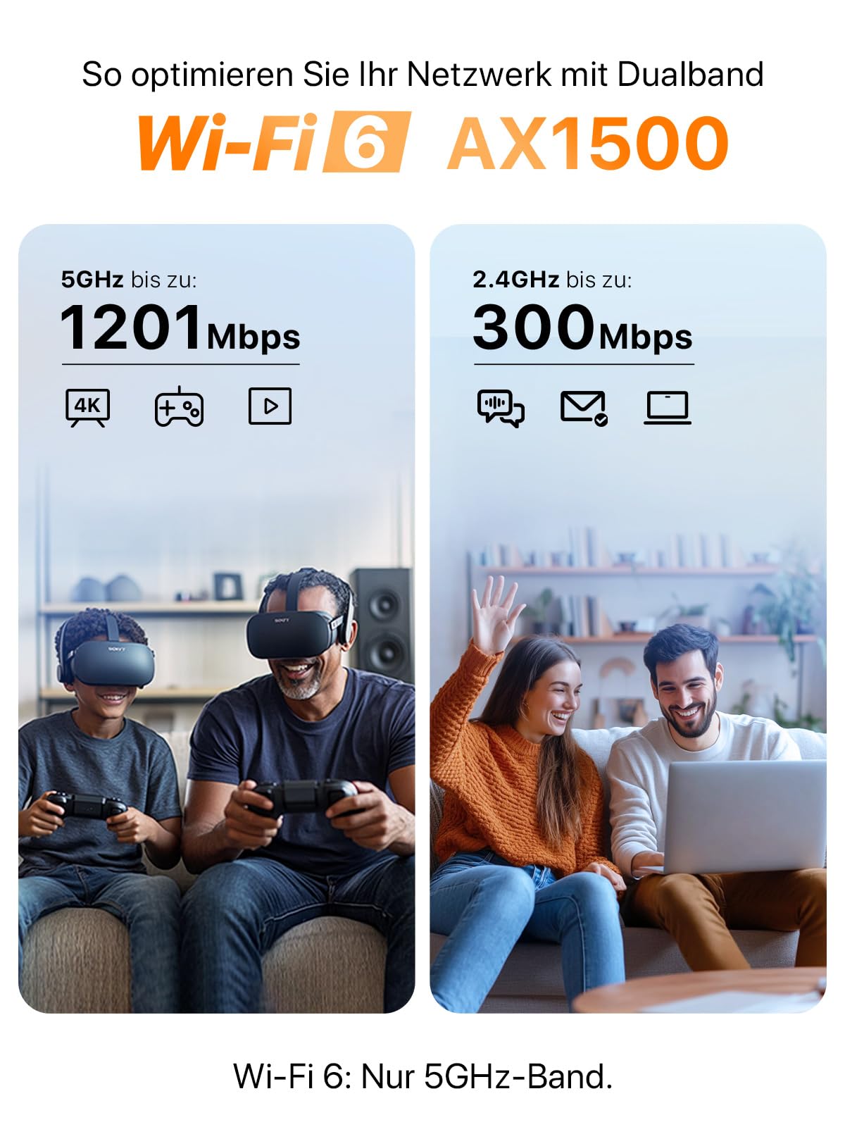 - 【Wi-Fi 6 AX1500】Geschwindigkeit bis zu 1201Mbps (5GHz) + 574Mbps (2,4GHz). Ideal für reibungslosere Video-Chats, HD-Streaming und Online-Spiele. Wi-Fi 6: nur 5GHz-Band