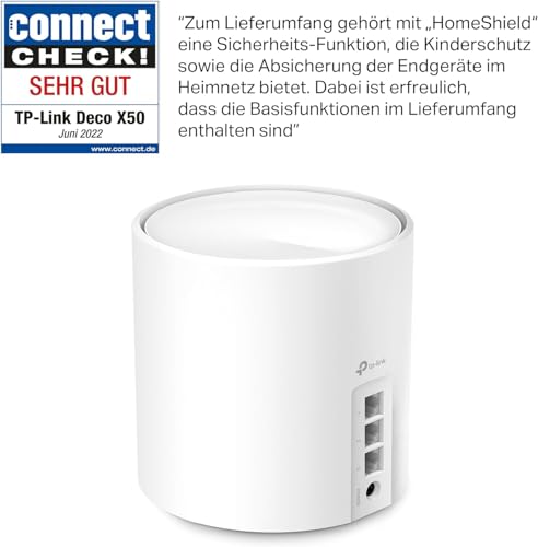 Einzelheiten: TP-Link Deco X50 AX3000 Wi-Fi 6 WLAN Mesh Set(Dualband 3000Mbit/s, Reichweite bis zu 232m², 3xGigabit-Ports, ohne Ladenzeiten, kompatibel mit Amazon Alexa, Schnellinstallation, HomeShield, 1 Pack)weiß. 100 Prozent WLAN-Abdeckung mit MESH 6 – das 1er-Pack Deco X50 Gehäuse bietet eine hohe Abdeckung von bis zu 232 m², ermöglicht die Verbindung von mehr als 150 Geräten gleichzeitig. Schluss mit Funklöchern Ultra-schnelle WLAN-Geschwindigkeit – WiFi 6 beschleunigt bis zu 3000 Mbit/s (2402 Mbit/s bei 5 GHz und 574 Mbit/s bei 2,4 GHz). Genießen Sie ein reaktionsfähigeres Spiel oder 8 K Streaming, wenn mehrere Geräte gleichzeitig Daten übertragen Kompatibel mit allen Betriebssystemen von ONTERNET – Ersetzen Sie Ihre bestehende WLAN-Lösung, Deco kompatibel mit allen Internet-Zugangsanbietern (Kabel, Glasfaser, DSL, etc.) Einfache Installation und Bedienung – Die Deco-App führt Sie Schritt für Schritt in die Konfiguration und ermöglicht es Ihnen, Ihr Netzwerk zu verwalten und zu steuern, egal wo Sie sind Sicherheit – Die Verschlüsselung WPA3 und TP-Link HomeCare bietet benutzerdefinierte Funktionen, einschließlich der Kindersicherung, der Anti-Viren und der Service-Qualität (QoS) für ein sichereres Online-Erlebnis Sprachsteuerung – Kombinieren Sie es mit Alexa, um das Deco X50 mit einfachen und praktischen Sprachbefehlen zu steuern