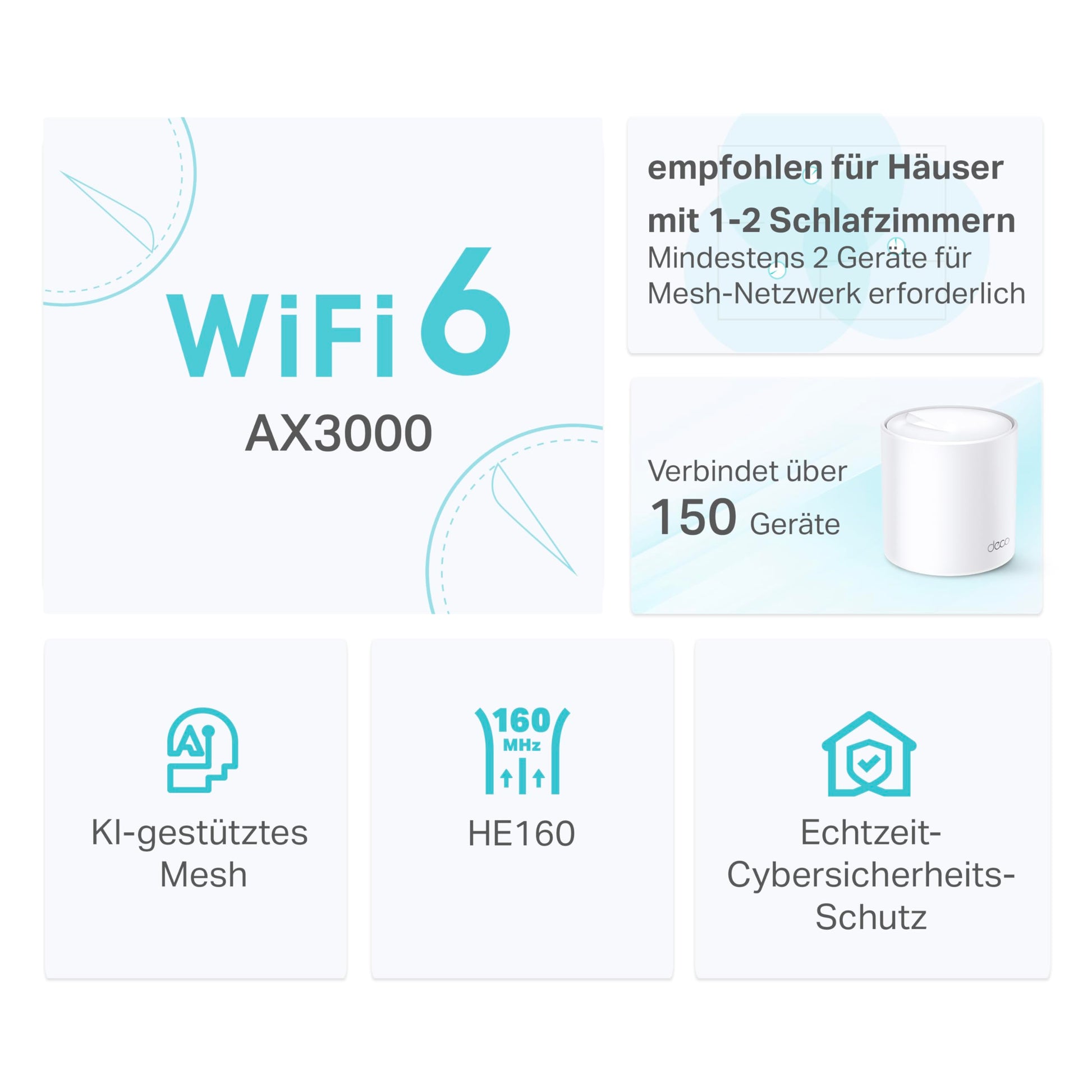 - Neue Lösung zum Aufbau eines Mesh-Netzwerks: Deco X50 ersetzt herkömmliche Repeater, WLAN-Router und Stromleitungen. Schließen Sie einen Deco an Ihr Modem an und platzieren Sie andere Decos überall dort, wo Sie Ihre WLAN-Abdeckung erweitern möchten