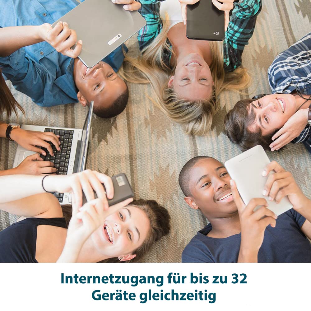 - 4G-Netzwerk – teilen Sie den Internetzugang mit bis zu 32 Wi-Fi-Geräten und genießen Sie Download-Geschwindigkeiten von bis zu 150 Mbit/s; * Dies ist die maximale theoretische Geschwindigkeit, die tatsächliche Geschwindigkeit wird durch die 4G-Abdeckung und die Hindernissen beeinflusst