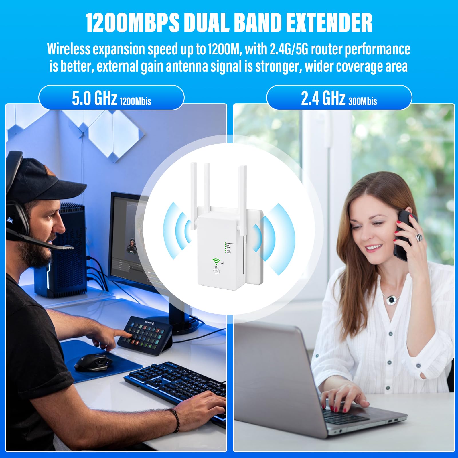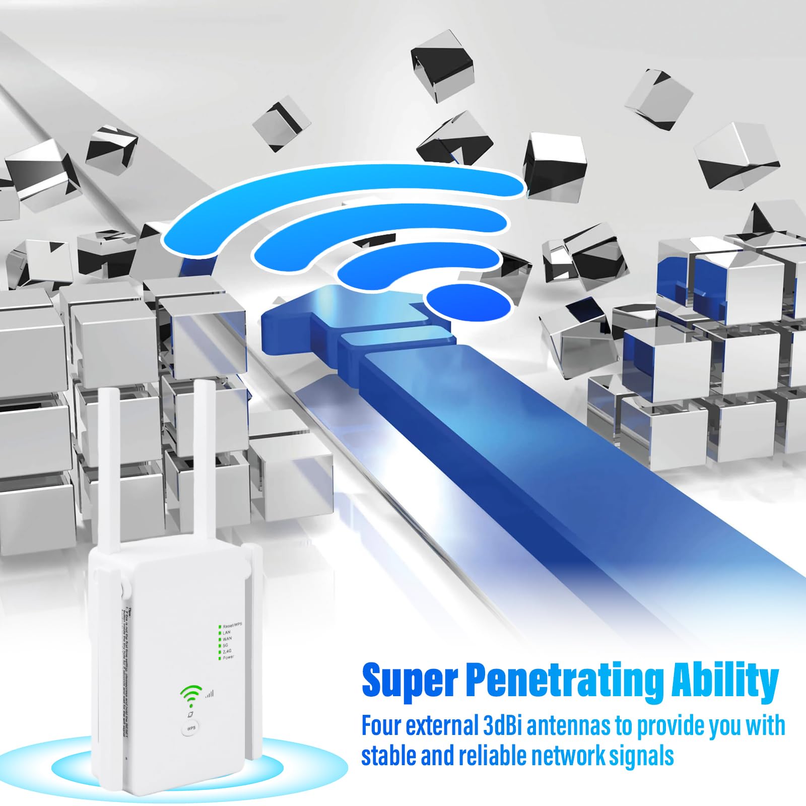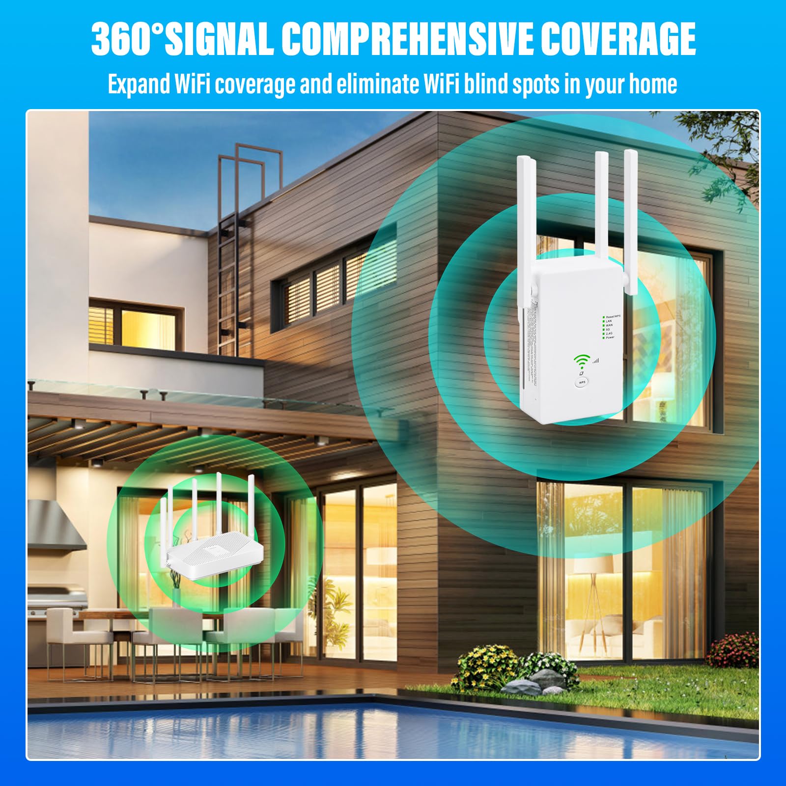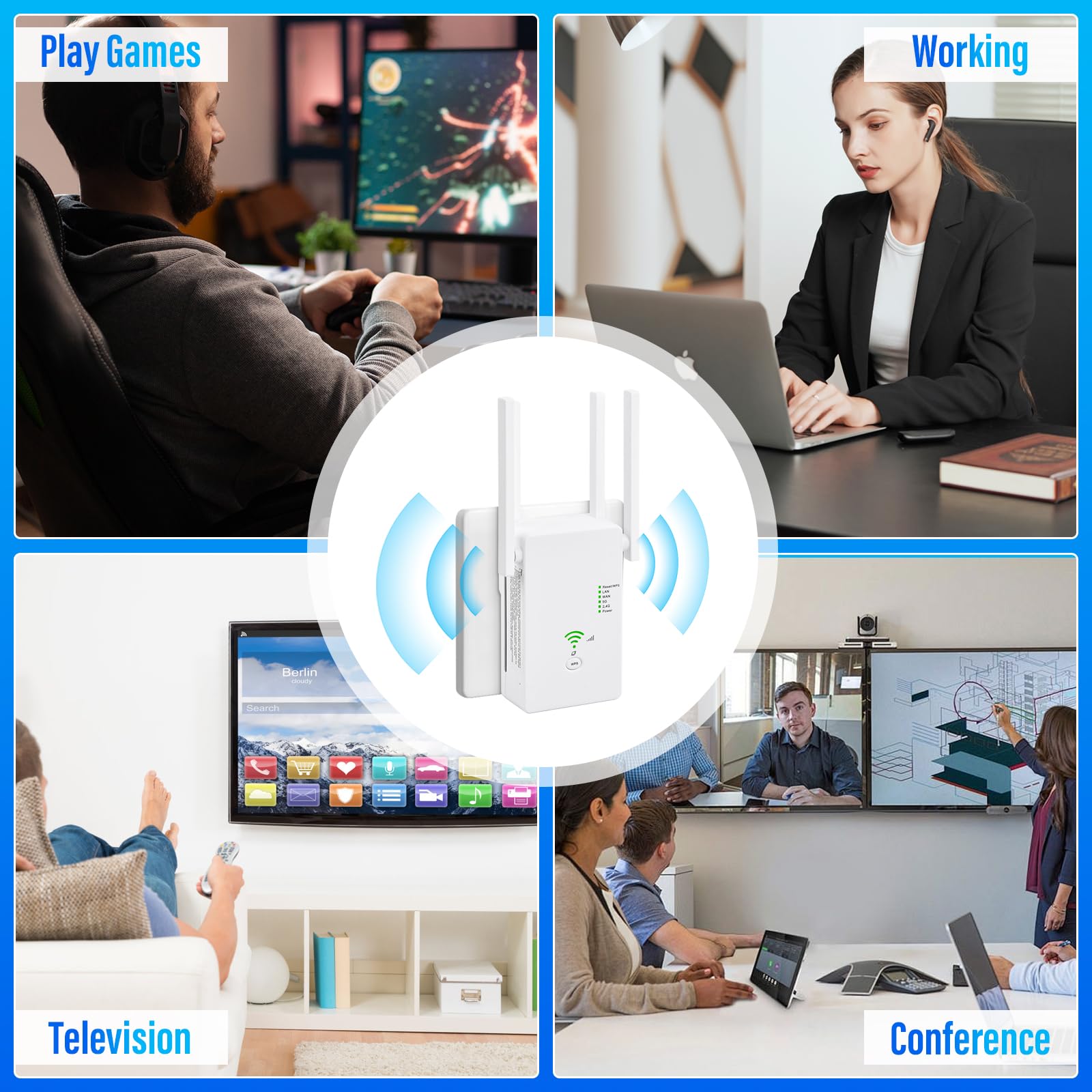 - 【360° WLAN-Abdeckung ohne Funklöcher】Ausgestattet mit 4 drehbaren 3dBi-Antennen sorgt der WLAN-Repeater für eine erweiterte 360°-Signalabdeckung. Ideal für schwer erreichbare Bereiche wie Schlafzimmer, Küche, Bad, Garage oder Keller – nie wieder Funklöcher!