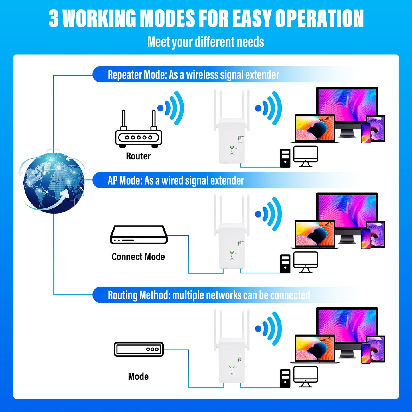 - 【3-in-1-Funktion: Repeater, Router & Access Point】Dank Ethernet-Port und Repeater/AP/Router-Modus verwandeln Sie jede kabelgebundene Verbindung ganz einfach in ein drahtloses Netzwerk. Kompaktes Design zur Wandmontage für flexible Platzierung und optimale Signalstärke.